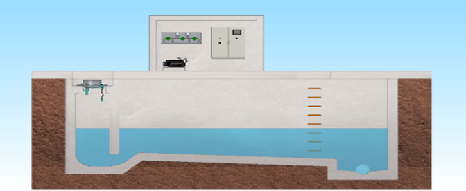 用于中大型调蓄池,雨水或者合流污水进入调蓄池,存水室水位上升,并进入真空存水室内, 真空泵自动开始抽吸空气,由于真空效应,水从廊道部分流入存水室。调蓄池清空后,冲洗程序自动启动。